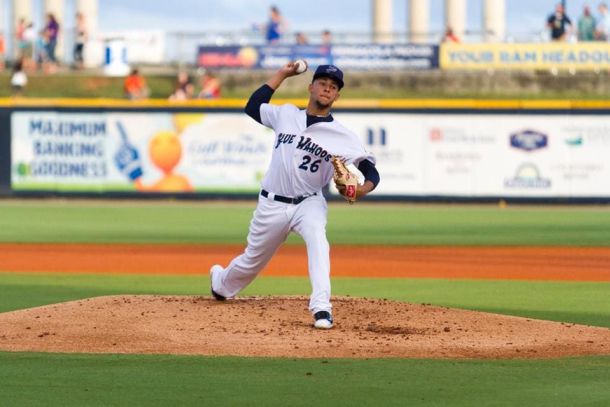 Luis Castillo speaks through an interpreter during a post-game interview to express his thoughts about the performance he turned in against the Mississippi Braves last Monday night at Blue Wahoos Stadium.