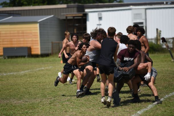 With the heat index, it’s probably feels like it’s at least 100 degrees on a late June morning in Navarre. Lee Jones is encouraging Raider players as they run sprints and navigate their way through weave drills on a sun-baked practice field.