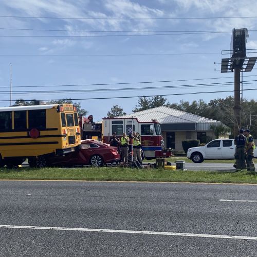Holley-Navarre Fire District was dispatched to the scene at 1:50 p.m. and found the woman’s vehicle, a Chevrolet, partially underneath the school bus.
