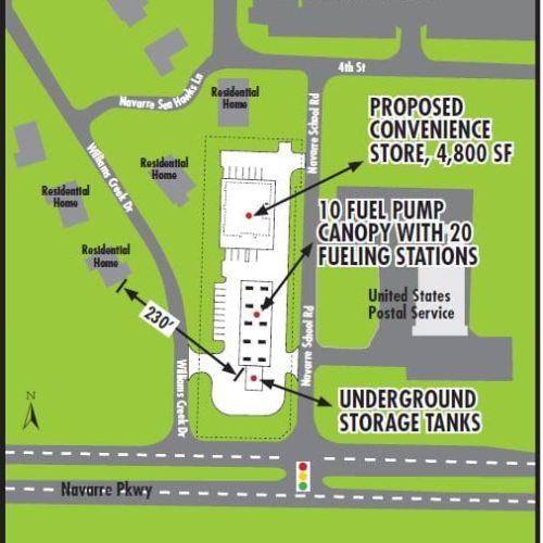 A proposed gas station for 8006 Navarre Pkwy. was not well received by some area residents saying that it would be in violation of land development code that required “hazardous or potentially hazardous materials” be stored or located at least 500 feet away from the nearest residential structure and the closest residence was only 230 feet away.