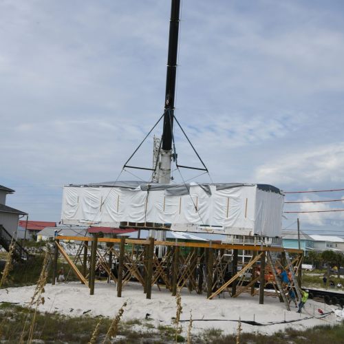By just after noon, one-quarter of a 3,000-plus square foot home had been trucked down the road, lifted and lowered into place. Within a few hours, that percentage was up to half. By sunset, the whole structure was expected to be in place on pilings.