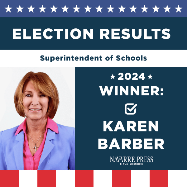 Karen Barber has been re-elected as the superintendent of Santa Rosa County schools. Barber received 16,710 votes, or 49% of the vote, to defeat David Godwin and Brenda Stephens. Godwin received 12,905 votes, or 38%, and Stephens received 4,328 votes or 12.75% of the vote. This story will be updated with more information.