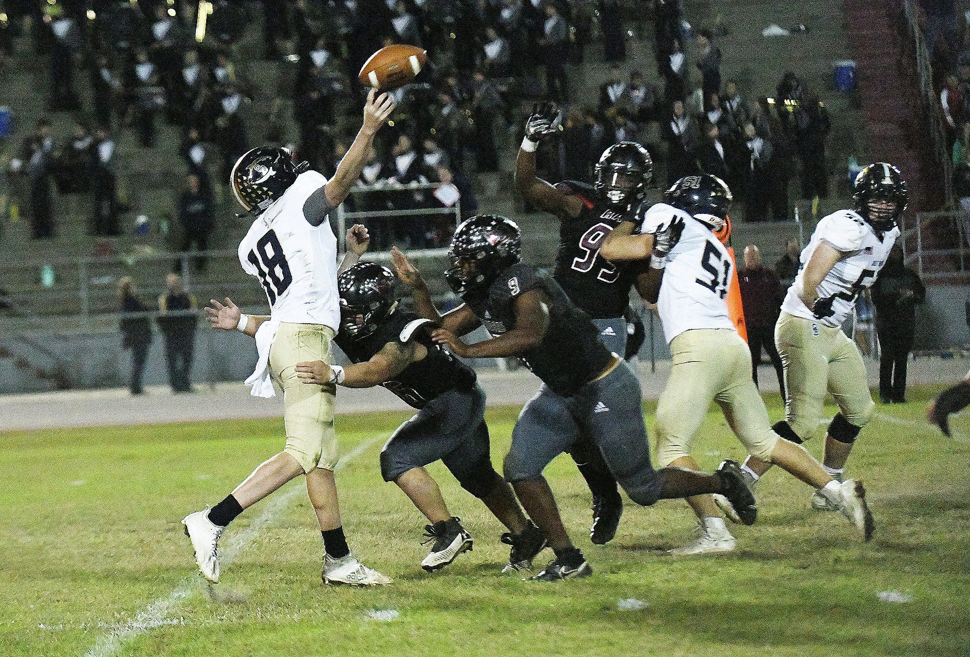 Navarre’s defense puts pressure on Gulf Breeze quarterback Battle Alberson Friday night. Photo by Dickie Williams