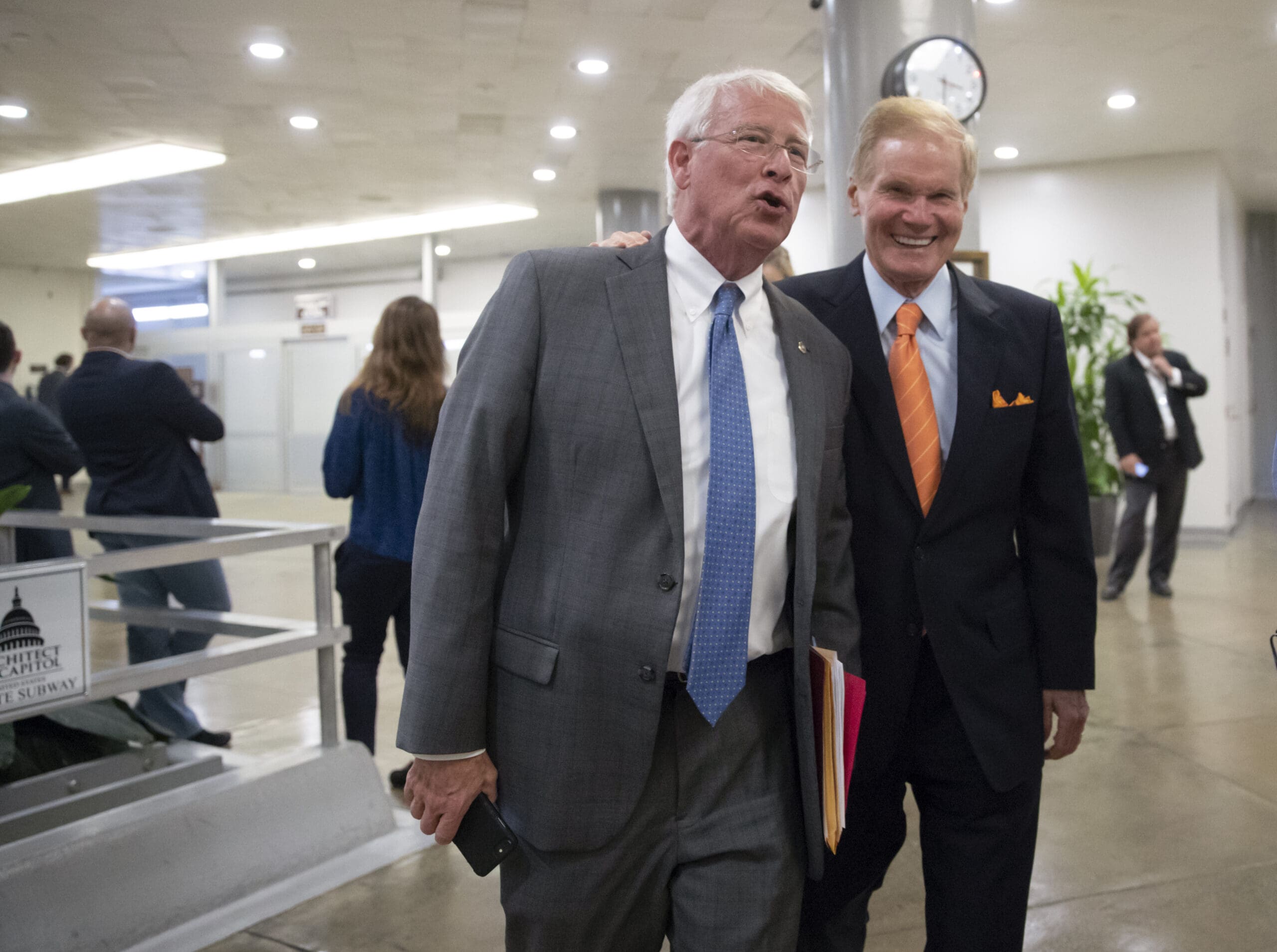 Sen. Roger Wicker, R-Miss., left, and Sen. Bill Nelson, D-Fla., arrive to vote on a bill to expand private care for military veterans as an alternative to the troubled Veterans Affairs health system, on Capitol Hill in Washington, Wednesday, May 23, 2018. (AP Photo/J. Scott Applewhite)