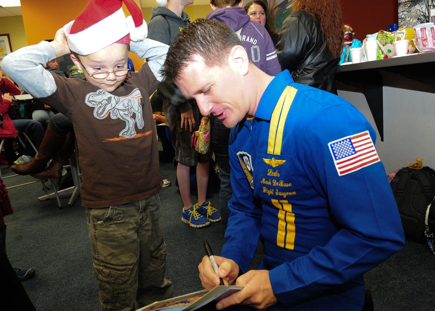 Blue Angels, Flight Surgeon Lt. Cmdr. Mark DeBuse signs an autograph for a child during the annual Snowball Express send-off event at the Pensacola Regional Airport USO.