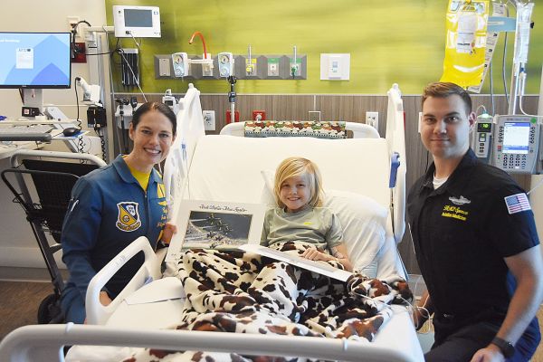 Patients and families at Studer Family Children’s hospital received a special visit from two members of the U.S. Navy Blue Angels flight demonstration squadron on Dec. 11, just before the holidays.