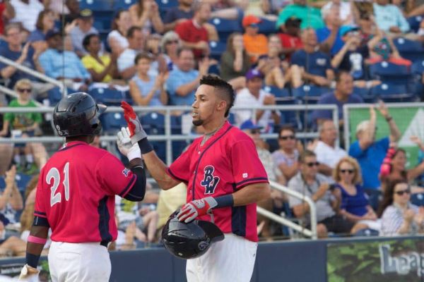 Cincinnati Reds star Billy Hamilton high fives Marquez Smith after scoring a run in Sunday’s 15-2 win over Mobile. Hamilton was in town for a three-day athletic rehab assignment and helped Pensacola clinch a playoff berth for the first time.