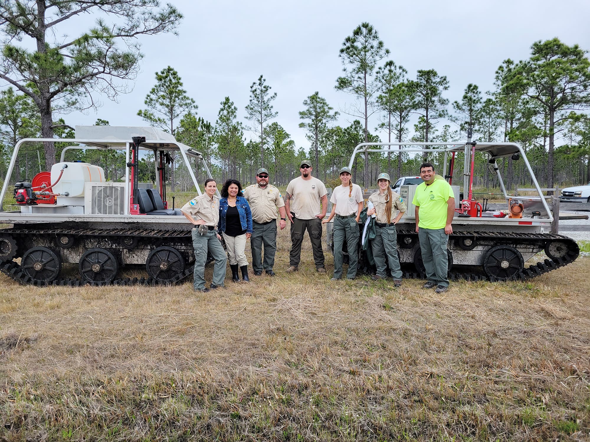 Yellow River Marsh Preserve employees stand with Grants and Restore Program Manager Naisy Dollar (jean jacket) for a photo after receiving their new equipment.