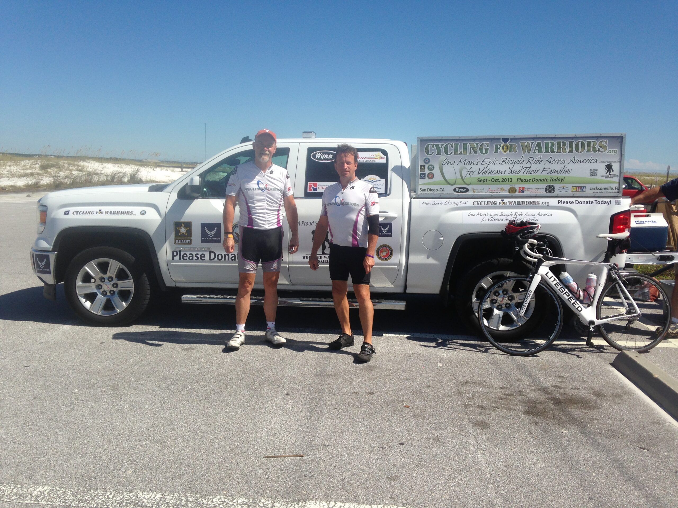 Retired Navy veteran Michael Schwartz and his brother Steve pedaled through Navarre Monday on their mission to raise money for wounded veterans and their families through the nonprofit Cycling for Warriors organization.