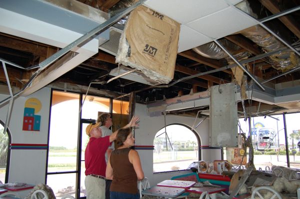 Jim Costner and Chris Curtis of J.C. Curtis Construction, along with Taco Bell district manager Gail Ferris, assess the damage to the Navarre Taco Bell after suffering fire damage it last Friday.