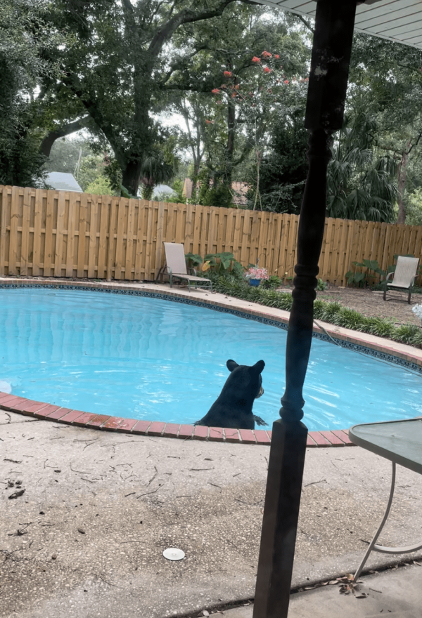 A black bear was captured on camera relaxing in an inground swimming pool behind a Gulf Breeze home Monday. He then used the steps to climb out and sauntered toward the trash in the side yard.