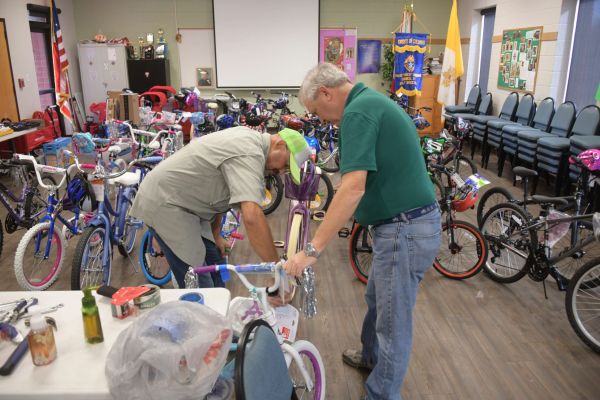 Chuck Howard and Andre Alonso work on bikes on Tuesday, Dec. 13, at St. Sylvester’s Church. Howard and Alonso are both part of Caring and Sharing of South Santa Rosa County.