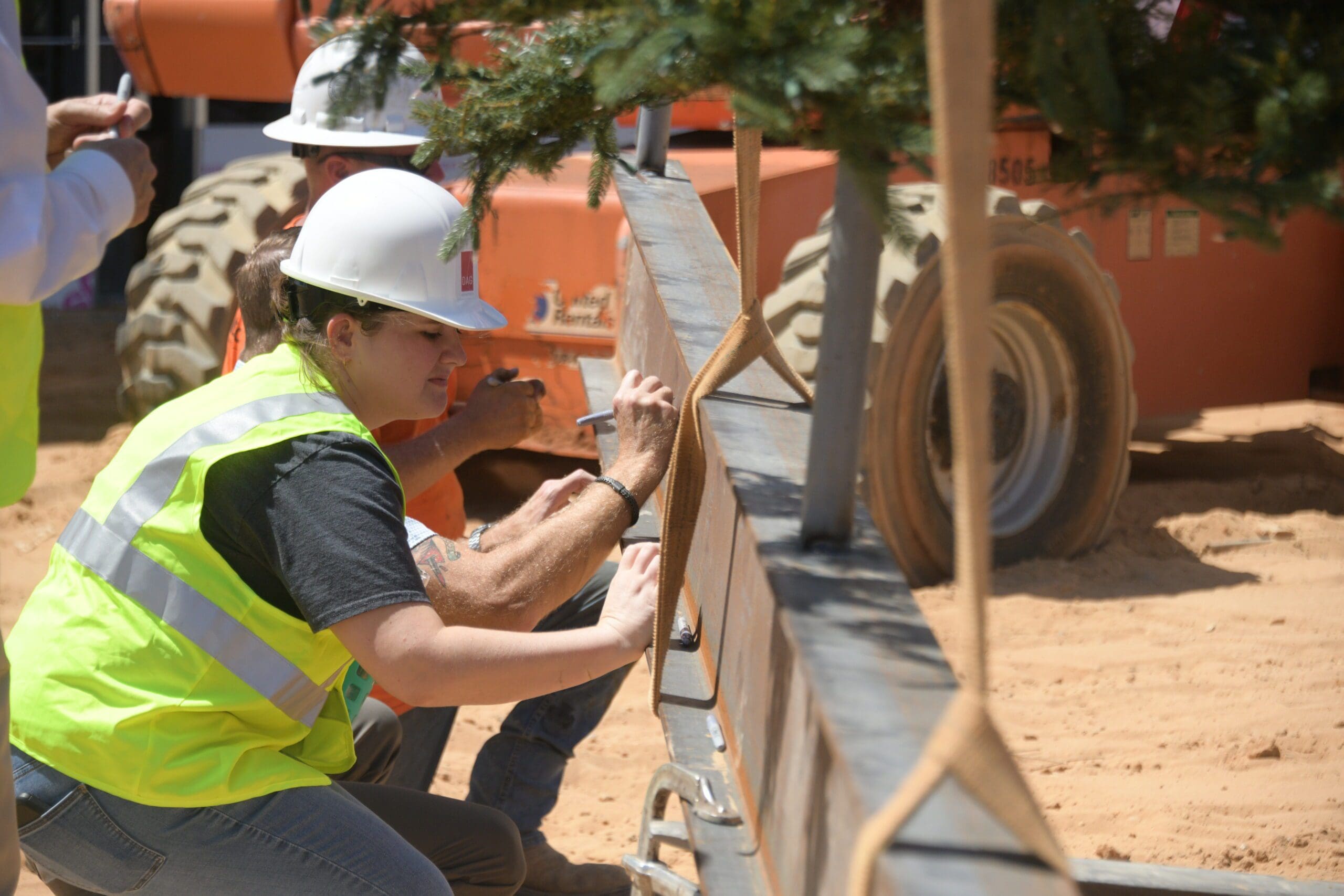DAG Architect representatives sign the beam before its attached to the school structure. Community leaders and Topping Out ceremony attendees signed the beam, which marks the highest point of construction on this project.