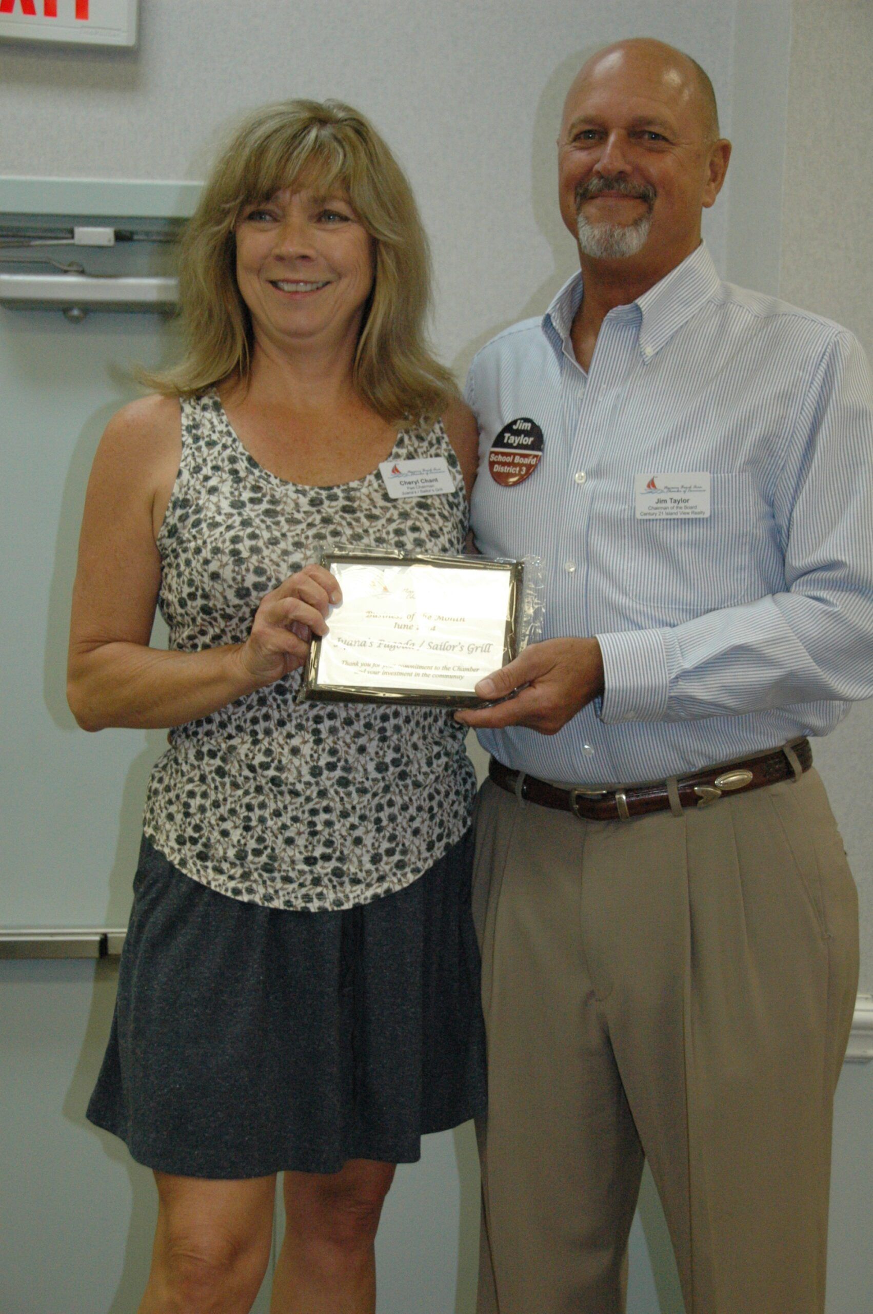 Cheryl Chant from Juana’s Pagodas/Sailors’ Grill accepts the June 2014 Business of the Month award from the Navarre Beach Area Chamber of Commerce.
