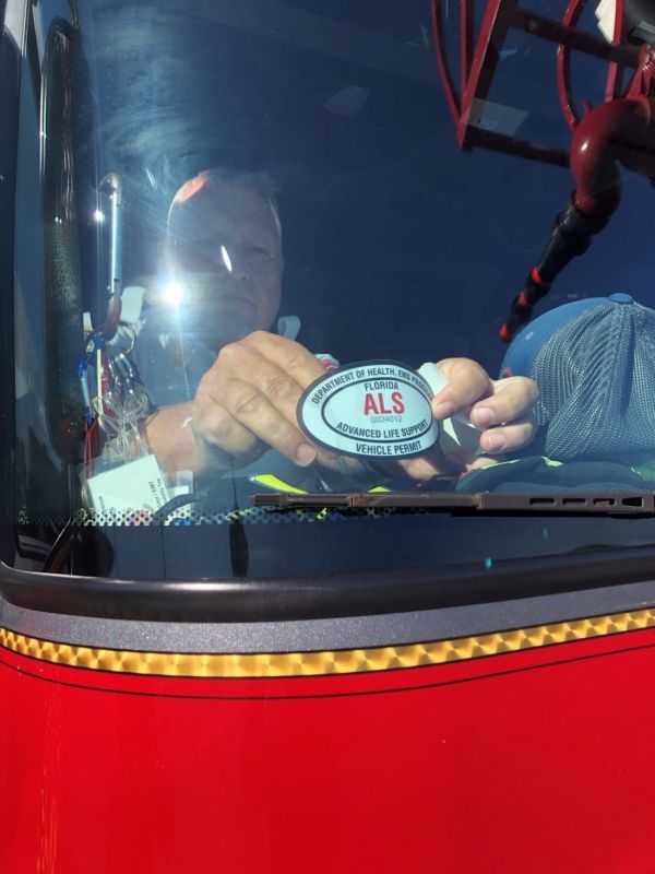 Navarre Beach Fire Rescue Chief Danny Fureigh makes it official Monday morning by placing this patch on the inside window of their truck. As of 9 a.m., the department is certified for Advanced Life Support. Photo by Wendy Victora Rudman