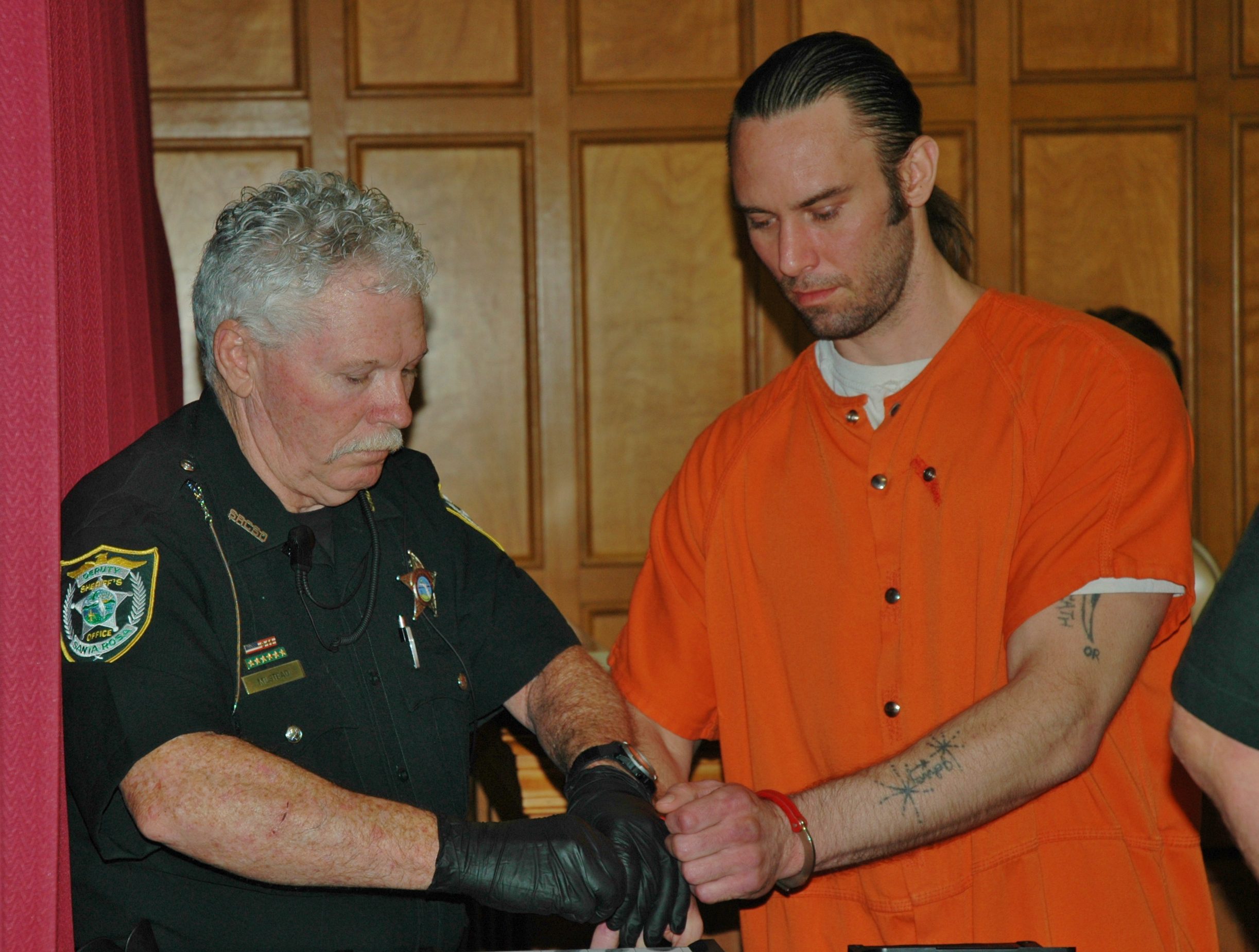 Deputy Ray Milstead processes John David Thomas Jr. following the Oct. 14 sentencing