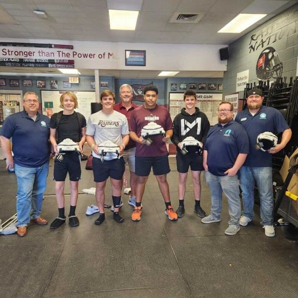 Navarre United Methodist Church presented the Raider football team 150 helmet guards that the players will wear on their helmets in practice for added protection from head injuries.