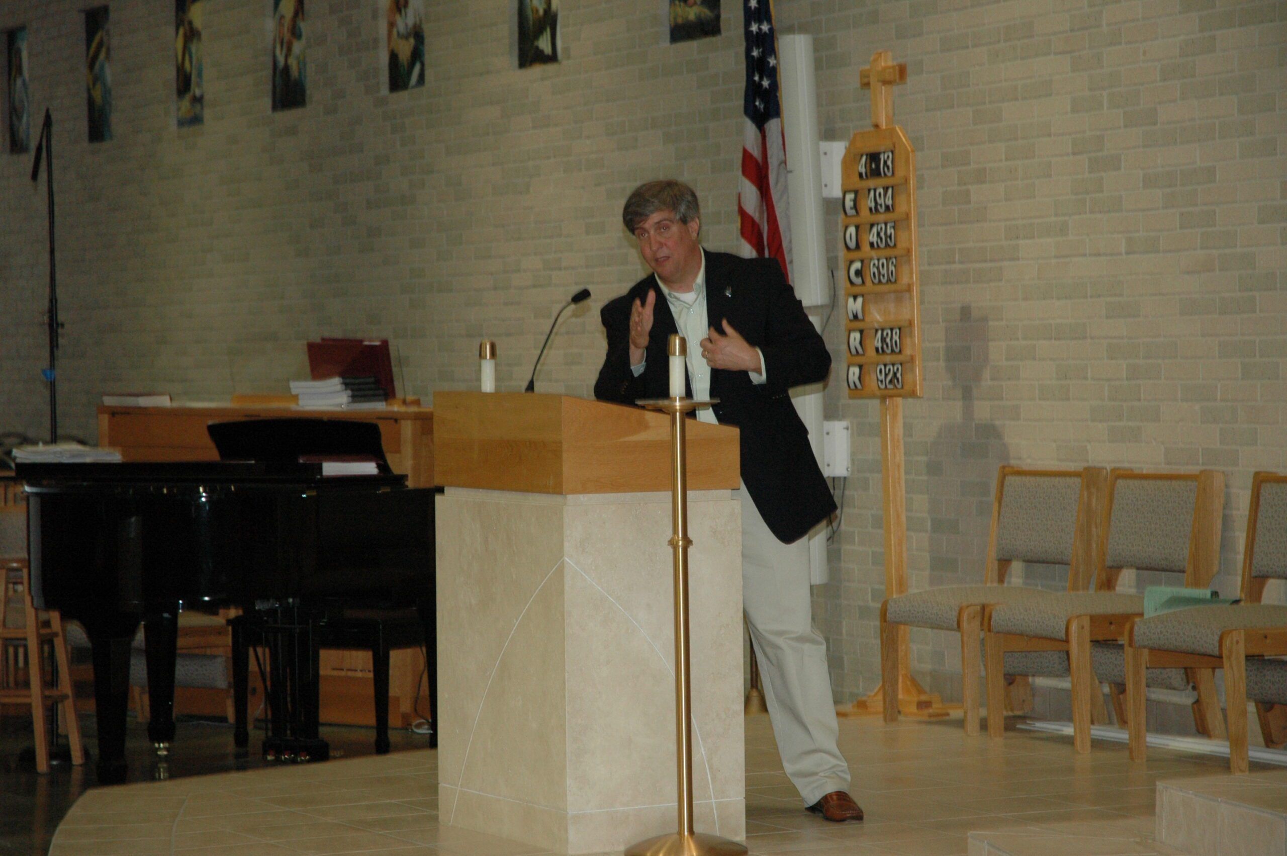 Escambia County Commissioner Grover Robinson IV addressed a crowd of Pensacola Beach residents at Our Lady of Assumption Catholic Church Monday night.