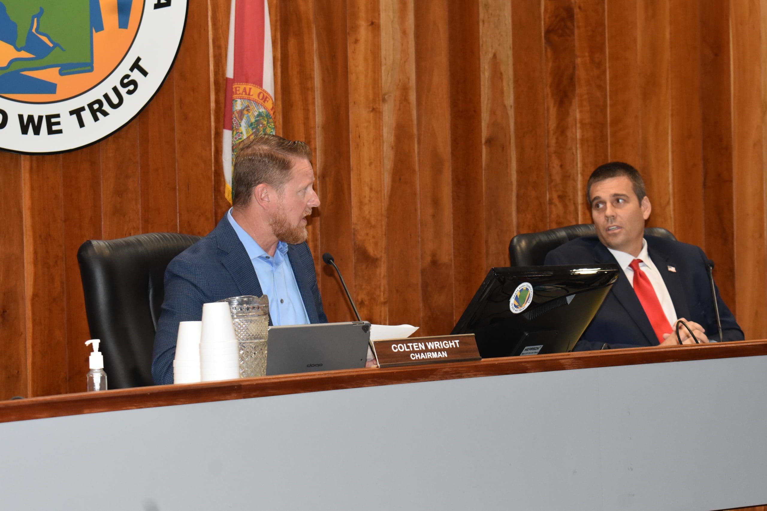 Santa Rosa County Commission Chairman Colten Wright asks Commissioner James Calkins not to introduce items addressing controversial national topics in order to share his thoughts on the matter with voters.