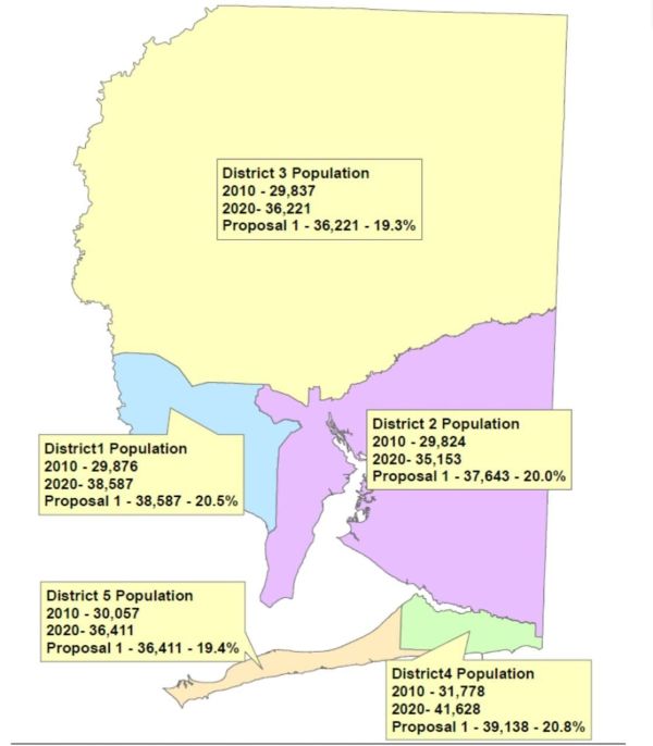 The proposed electoral district map moves the 2,490 north East Bay River citizens to District 2. Graphic from Santa Rosa Census report