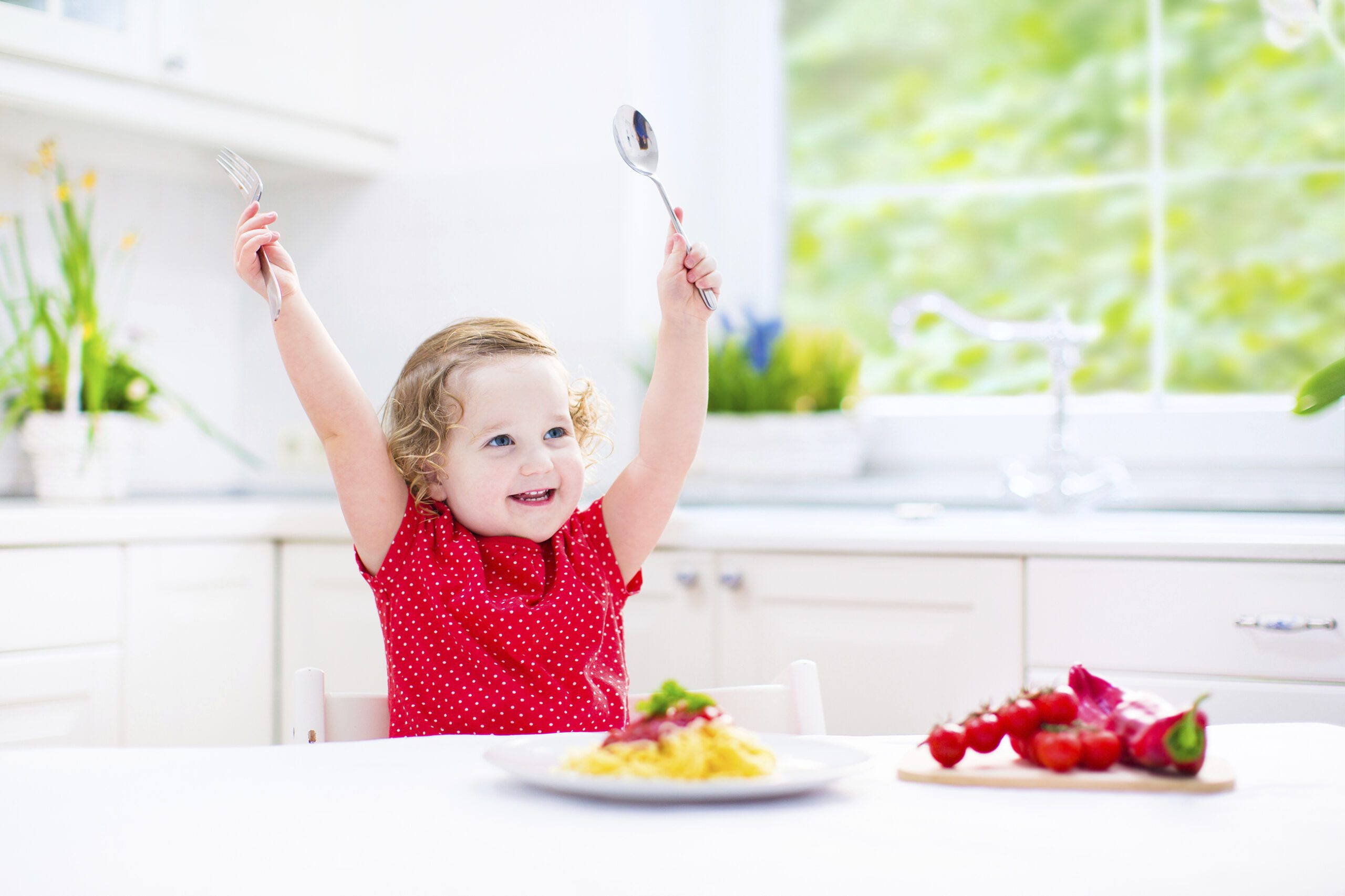 Laughing toddler girl playing with fork and spoon eating spaghetti