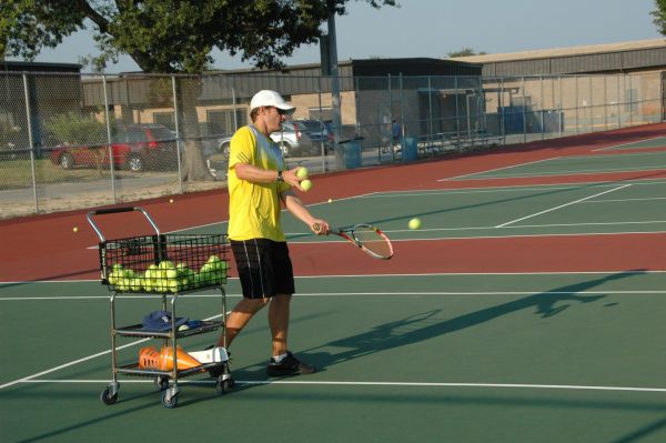 Rob Smakey provides a lesson July 7 at the Gulf Breeze High School tennis courts. Smakey typically uses the courts at Shoreline Park, but they have been closed since floodwater damaged them April 29.