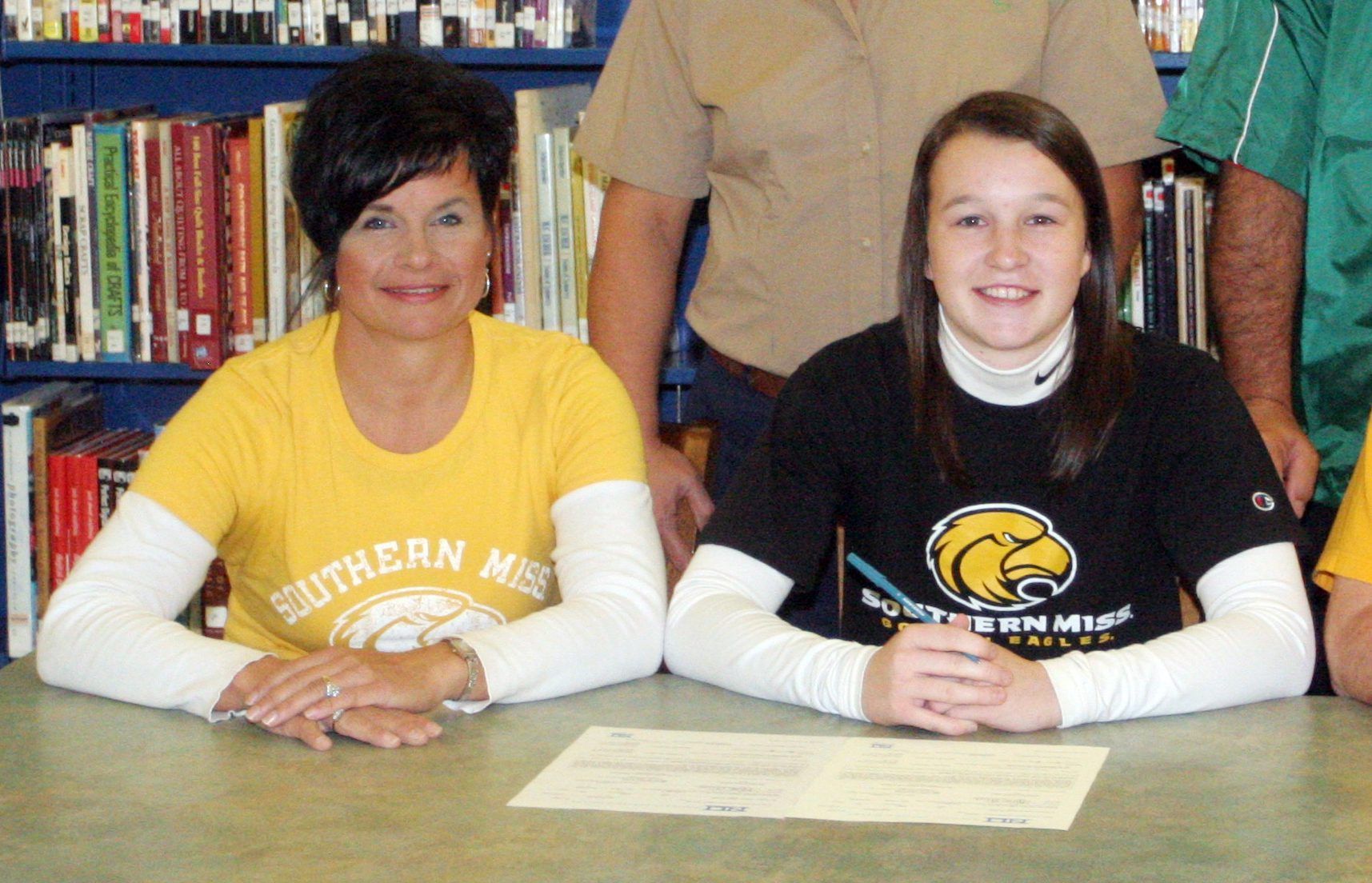 Lake Placid’s Alex Coyne, center, signed a basketball scholarship with The University of Southern Mississippi on Wednesday. LP girls basketball coach and mother, Jackie Coyne, and father, Terry Coyne, look on. Back row, LP athletic director Cindy Rivers and dean of students Dan Coomes.__MARK PINSON/STAFF