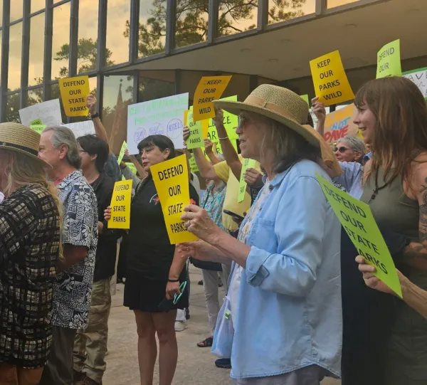 Opponents rallied Tuesday in Tallahassee against a plan to put golf courses, lodges and pickleball courts in state parks. (Photo by Jim Turner)
