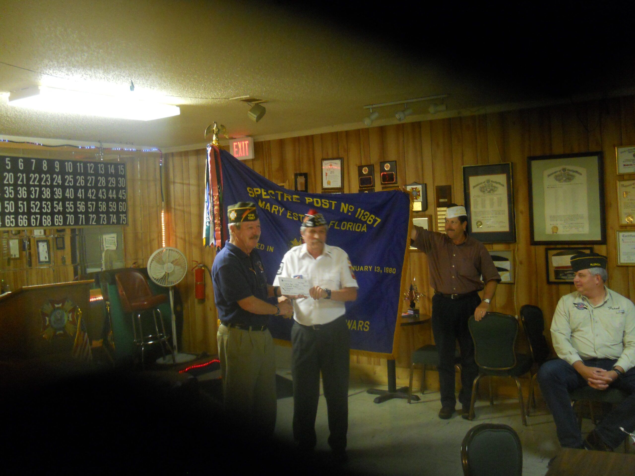 VFW Spectre Post 11367 recently received a new, updated flag after having used the flag from the old VFW post from Destin after that post lost its building. Seen accepting the flag and a check to pay for the flag are VFW member Bob O’Donnell (left) and Spectre Post Commander Ron Engberg.