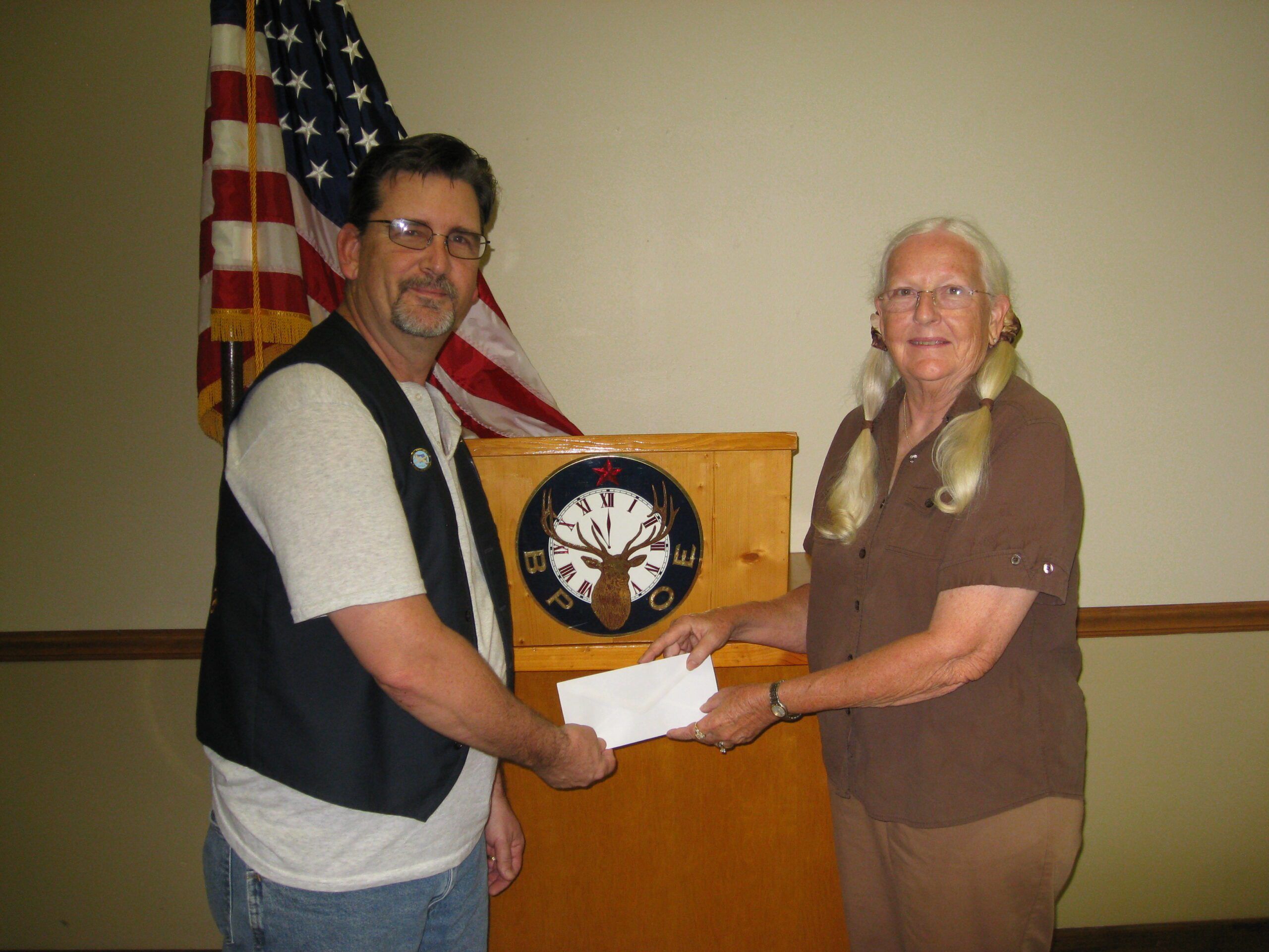 Tom Stevens, President of Holley-Navarre Elks Lodge #2787, presents a check for the Panhandle Butterfly House (PBH) to PBH Treasurer Peggy Gray.