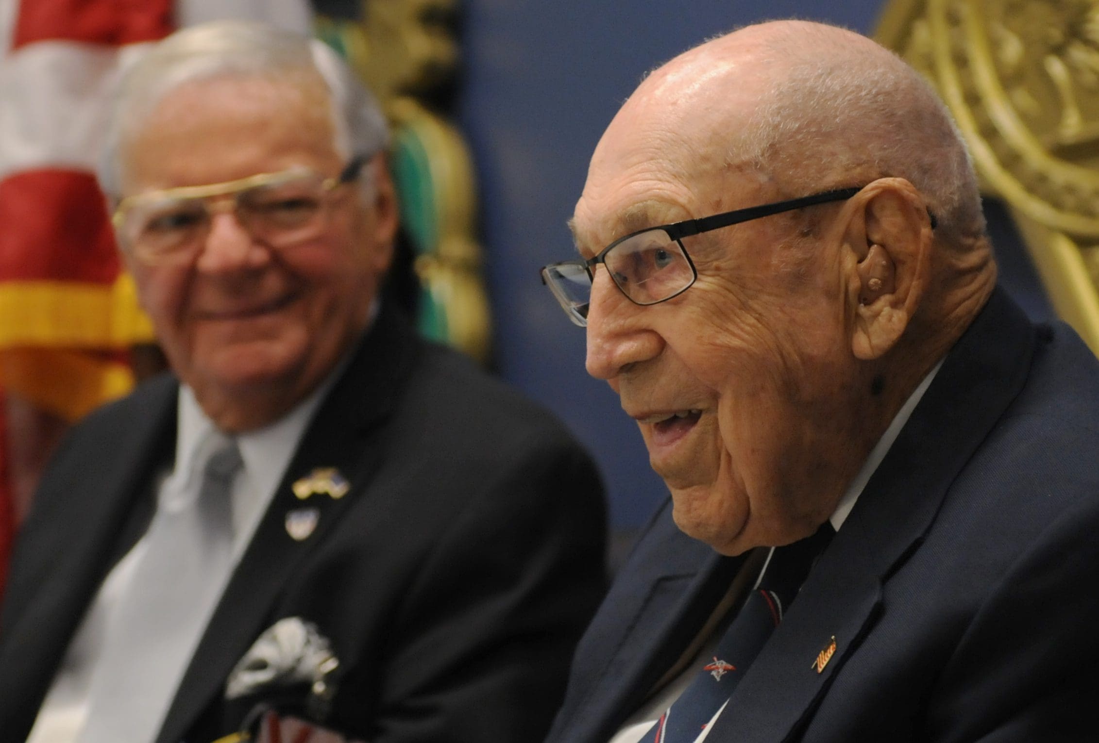 Retired Lt. Col. Robert E. Cole, a B-25 Mitchell bomber co-pilot and survivor of the Doolittle Raid on Tokyo, answers questions in the Airman’s Hall at the Pentagon, Nov. 5, 2105. Cole toured the Pentagon and met with service members to share the history of the Doolittle Raiders