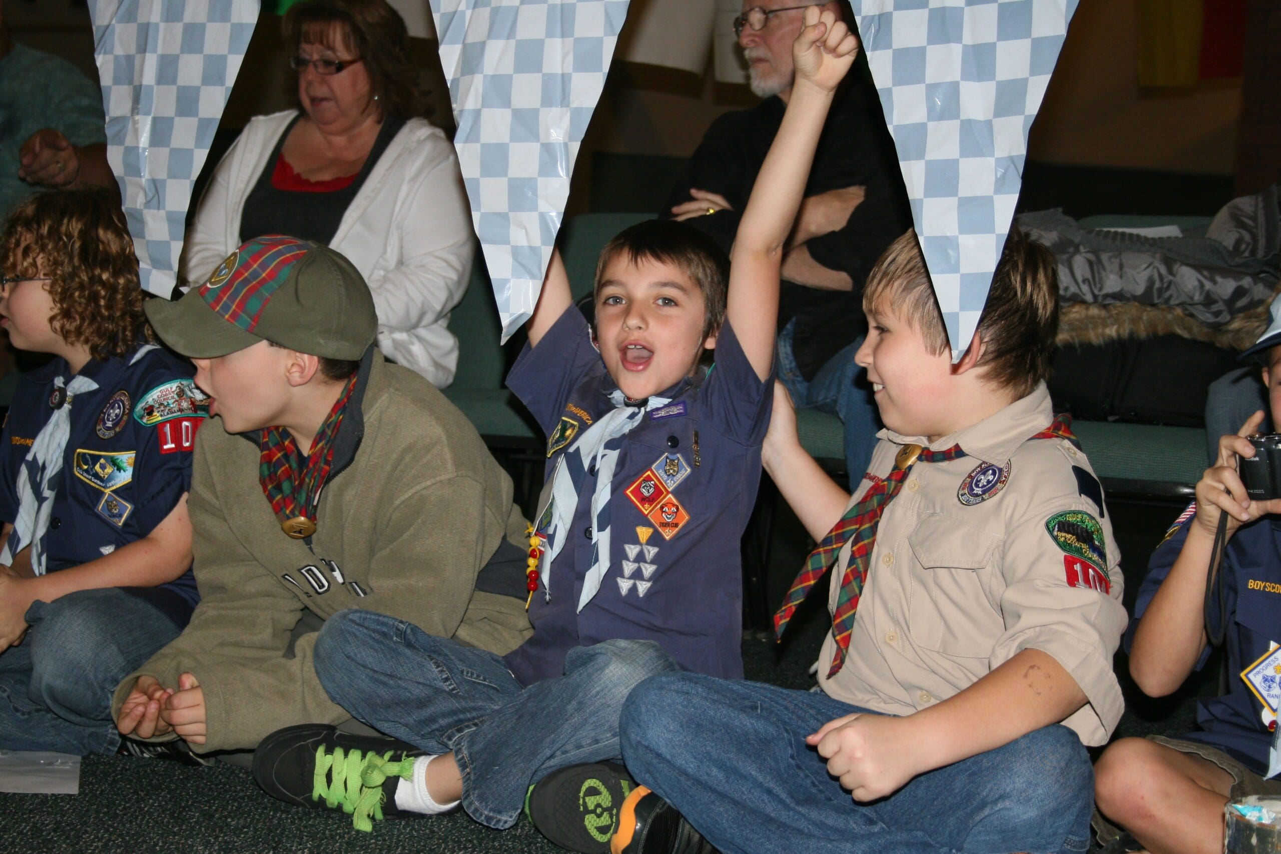 Chase Turner, 9, cheers on his car the “Silver Wolf” as it finished first in one of his first heats of the day during the his Cub Scouts packs pinewood derby competition Saturday Jan. 19. By the end of the day Turner earned the fastest time of all the Cubs in Pack 104.