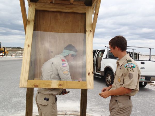 Boy Scouts David Reiter and Max Tuel work to install an information kiosk at the Navarre Beach Sea Turtle Conservation Center.