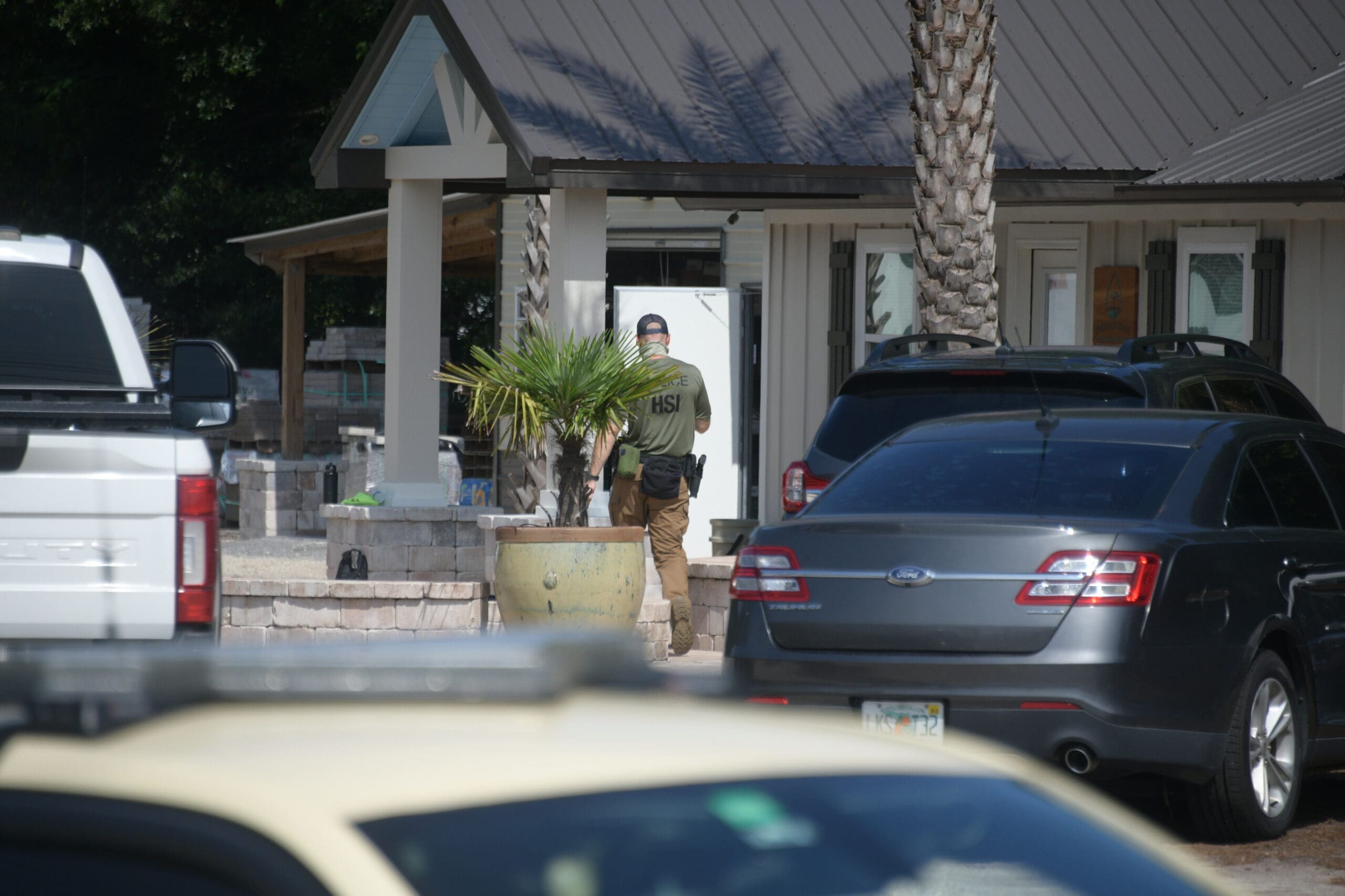 A member of Homeland Security Investigations (HSI) walks toward the office of Emerald Coast Lawns.