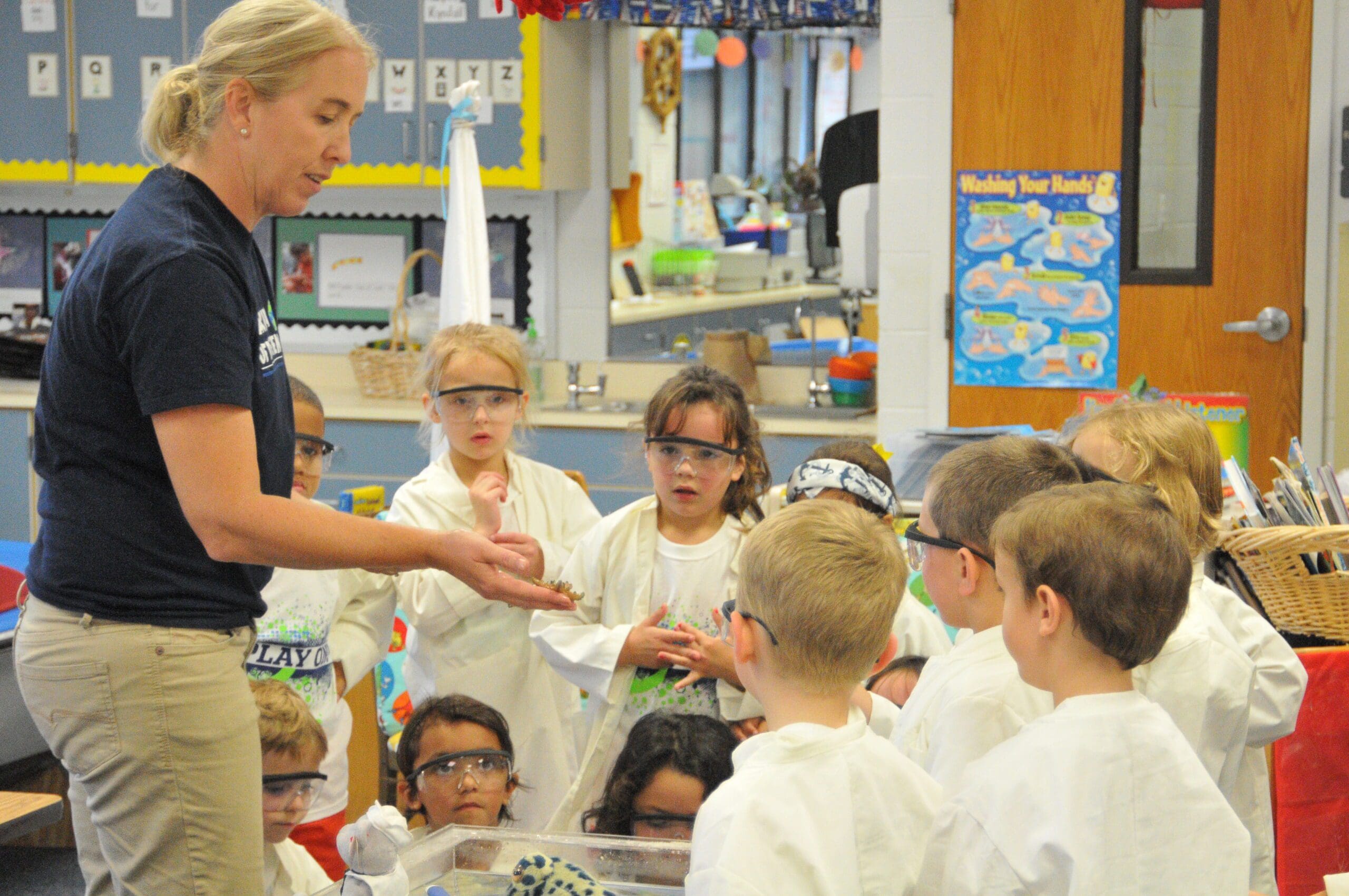 Emily Simon, West Navarre Primary’s Teacher of the Year, uses innovative ways to teach her students. Students put on their lab coats and glasses to work with marine life in the touch tank Emily set up in her classroom.