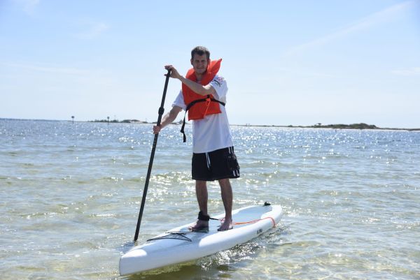 Eric Sines heads out on the Santa Rosa Sound on his paddleboard, the water calm, the sun shining and the wind blowing lightly on a Wednesday morning in Navarre.