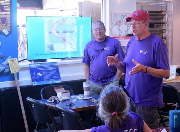 Ralph Agnew talks about sea turtle nesting and stranding efforts during a Navarre Beach Sea Turtle Conservation Center Sea Turtle Rescue Team Coffee & Conversation. These events are held weekly, on Tuesdays, at Espresso Lane on Navarre Beach. Also pictured, Scott Dexter.