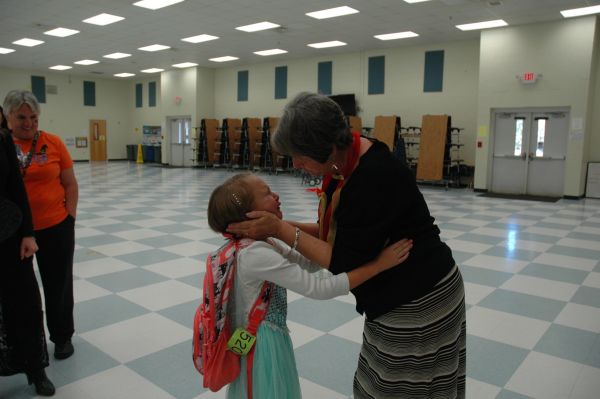 Sandi Eubanks comforts one of her students after her farewell celebration. “The best part of missing people is you know you have someone to love,” she said. Eubanks retired as the principal of West Navarre Primary School on Oct. 31.