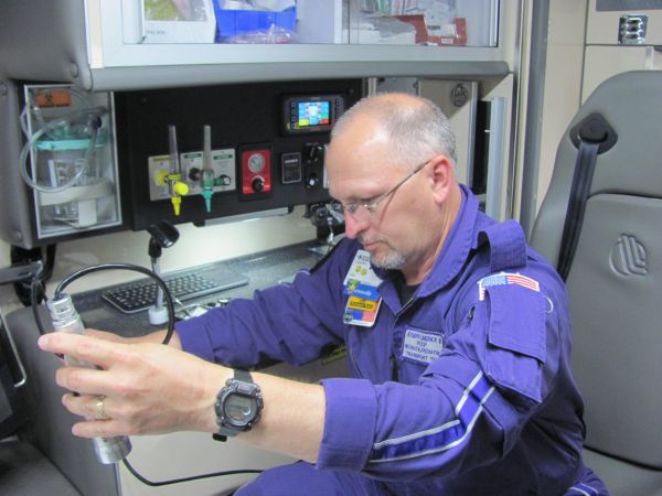 Joseph Limerick, pediatric critical care paramedic, demonstrates a mini exam camera, one of the new pieces of telemedicine equipment being used by The Children’s Hospital at Sacred Heart. While examining a patient in transport, Limerick holds the camera to a body part, such as the eyes, nose or mouth. The image is transferred to a computer and seen by a physician inside The Children’s Hospital in Pensacola, who can assess a patient remotely and even give orders for treatment before the child arrives at the hospital.