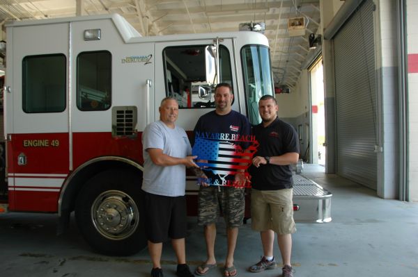Shane Kahl, Danny Fureigh and Dan Neisius pose with an American flag Kahl and Neisius made out of steel.