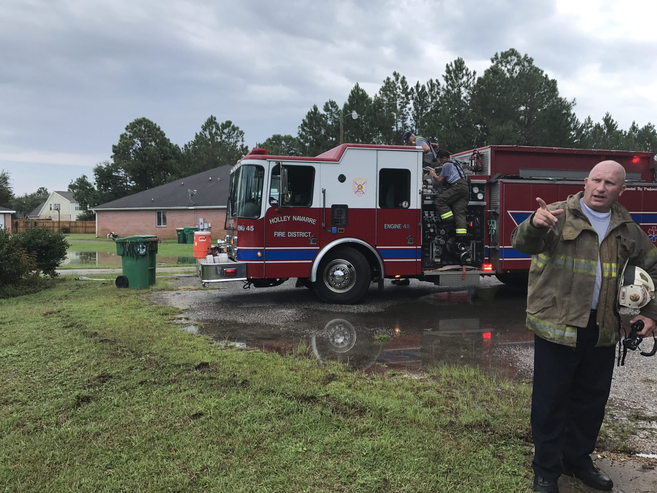 Holley-Navarre Fire District Battalion Chief Howie Rounsaville stands at one end of a trench dug into a residential yard by lightning Aug. 12.
