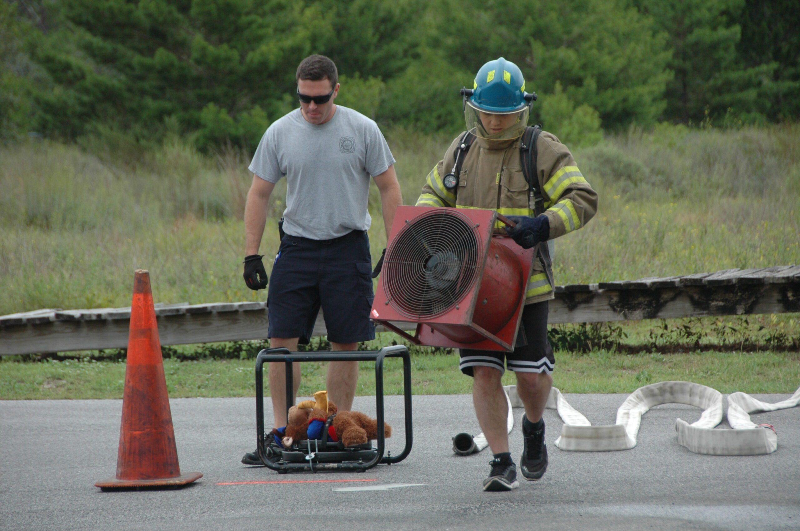 Firefighters carried a “smoke ejector” 50 feet before carrying a 75 pound cage, simulating a jaws motorized unit, another 50 feet.