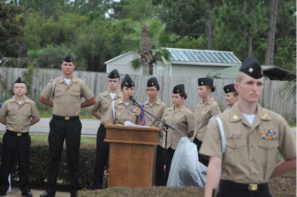 The Junior ROTC color guard raises the flag during a ceremony Friday morning at Navarre High School.