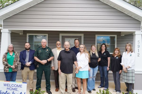 County officials, Sheriff’s Office personnel and others stand with the Sayles family at their new home on Congress Street in Midway.