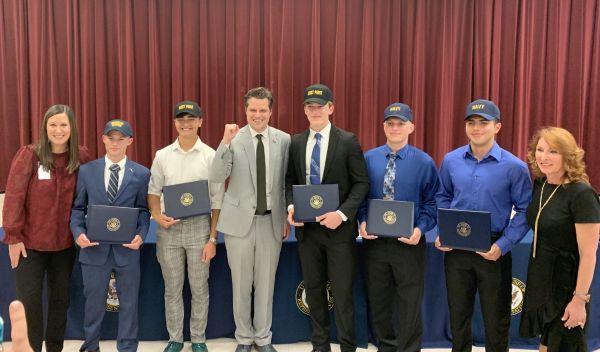 U.S. Rep. Matt Gaetz, Navarre High School Principal Kasie Windfelder, left, and Santa Rosa County Superintendent of Schools Karen Barber, right, posed with NHS’ five 2023 nominees for enrollment in military academies: Brent Anderson, Peyton Daugherty, Phelan Delaney, Seth Garcia and Noah Haack.