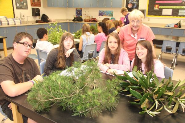 Cliffogene Stillwell helps Xavier Marcinak, left, Hannah Snider, Rachel Davis and Sierra Brown identify different types of plants