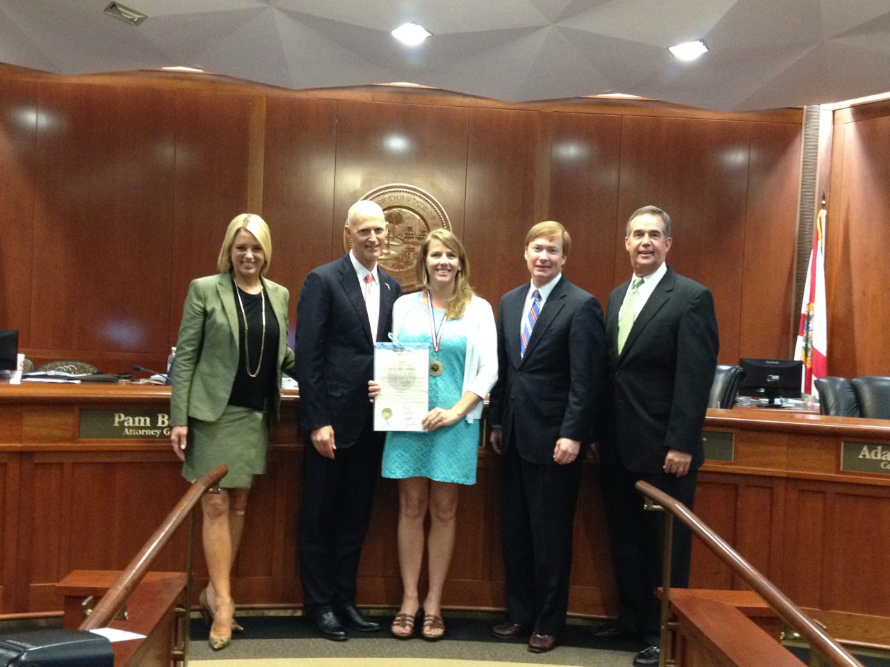 Fla. Gov. Rick Scott presents Danielle Clark of Holley-Navarre Intermediate with the Governor’s Shine Award. Pictured left to right” Fla. Attorney General Pam Bondi, Gov. Rick Scott, Danielle Clark, Fla. Agriculture Commissioner Adam Putnam and Fla. CFO Jeff Atwater.