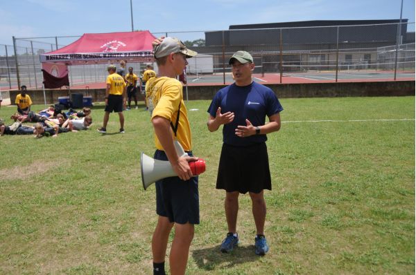 Timothy Grier is under a tent as the battle of the squads plays out at Navarre’s Navy Junior ROTC camp for the incoming class of cadets. The retired 1st Sgt. from the United States Marine Corps Is talking with Master Chief Jimmy Ethridge, who is set to retire officially as an ROTC instructor next week.