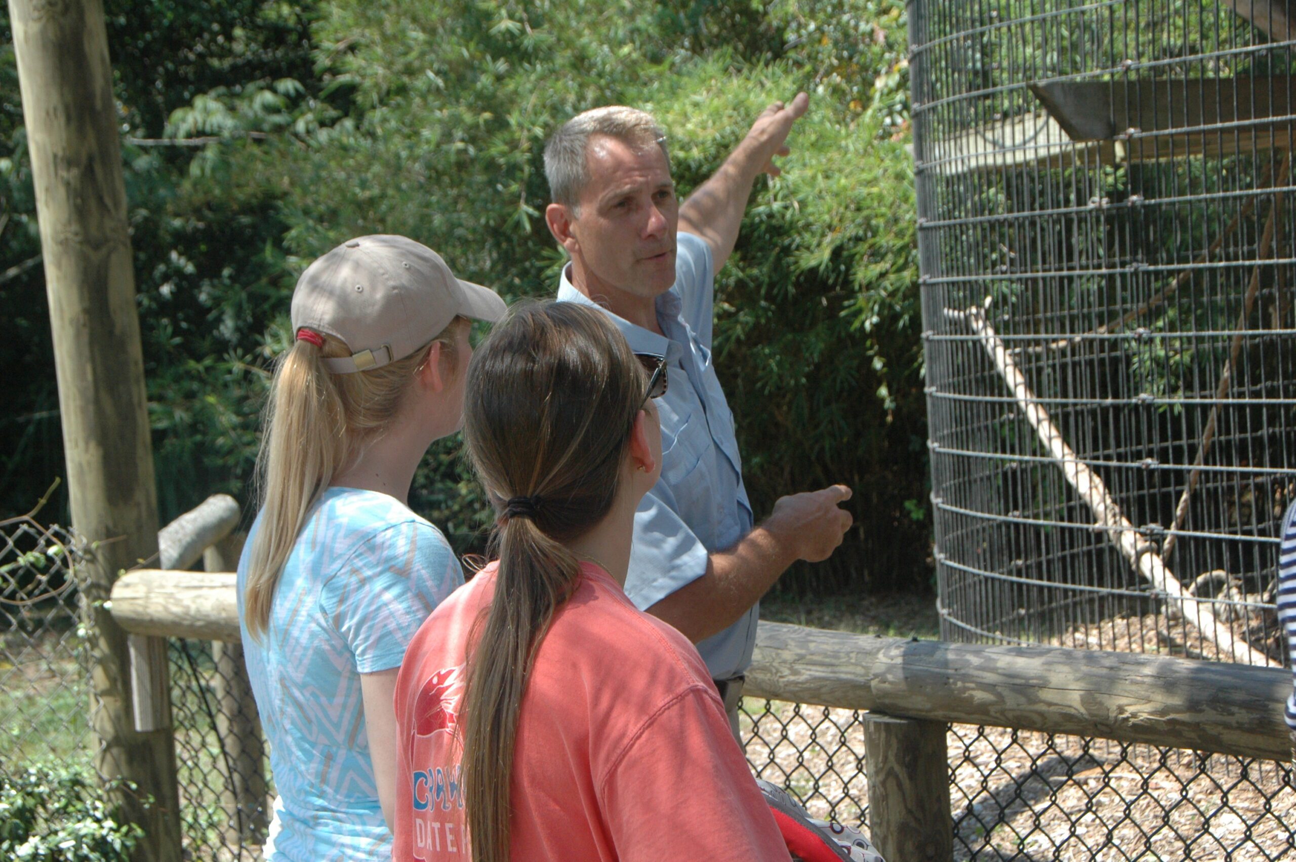 Gulf Breeze Zoo Director Steve Jagielski talks with zoo patrons Monday about Siamangs, the loudest and largest of the gibbons.