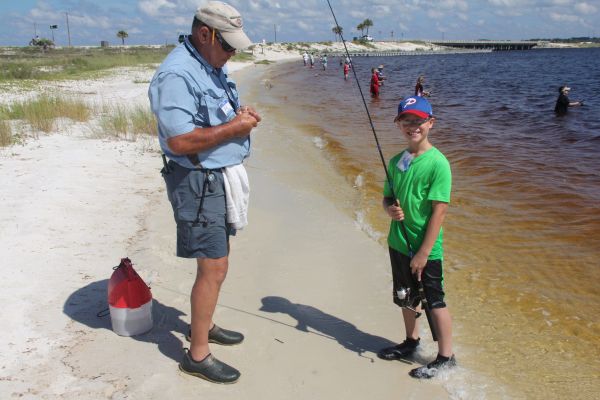 BK Stoeser, left, helps Hayden Rogers, 9, hook his shrimp bait
